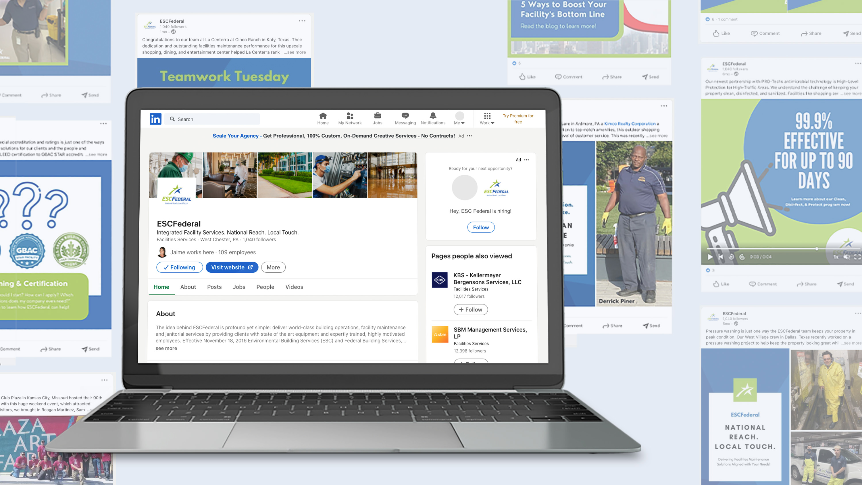 We are happy to be partnered with ESCFederal since 2014. The idea behind ESCFederal is profound yet simple: deliver world-class building operations, facility maintenance, and janitorial services by providing clients with state-of-the-art equipment and expertly trained, highly motivated employees. The result – over 50 years of experience serving customers coast-to-coast. LMI360 provides monthly support across a range of services. Campaigns for specific industry targets An effective tailored LinkedIn strategy A picture is worth a thousand words… So, for video? A SEO-focused website reflects the brands core values Case Study