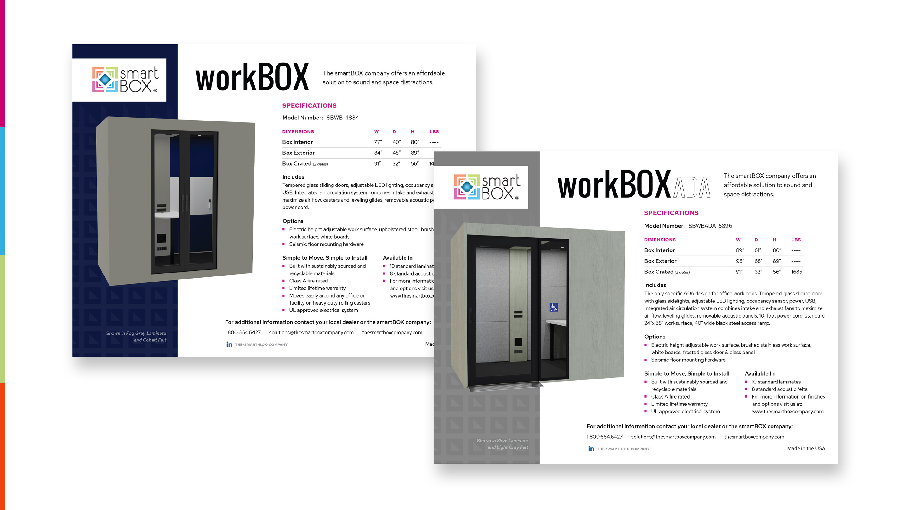 smartBOX launched in the fall of 2019 at IFMA’s World Workplace in Phoenix, AZ with a single product, an office phoneBOX. The goal was to provide a modern solution for sound and space distractions. LMI360 has supported the evolution of the brand including national market research, logo creation, a full website refresh, extensive collateral development, social media enhancements, press release creation, CRM configuration, and an ongoing outreach campaign. We are happy to be a core part of the team that is helping to grow an American Manufacturing company. From logo to style guide to full brand guidelines. A SEO-focused website reflects the brands core values. Spec Sheets, Brochures, and Press Releases. An effective tailored LinkedIn strategy. Case Study
